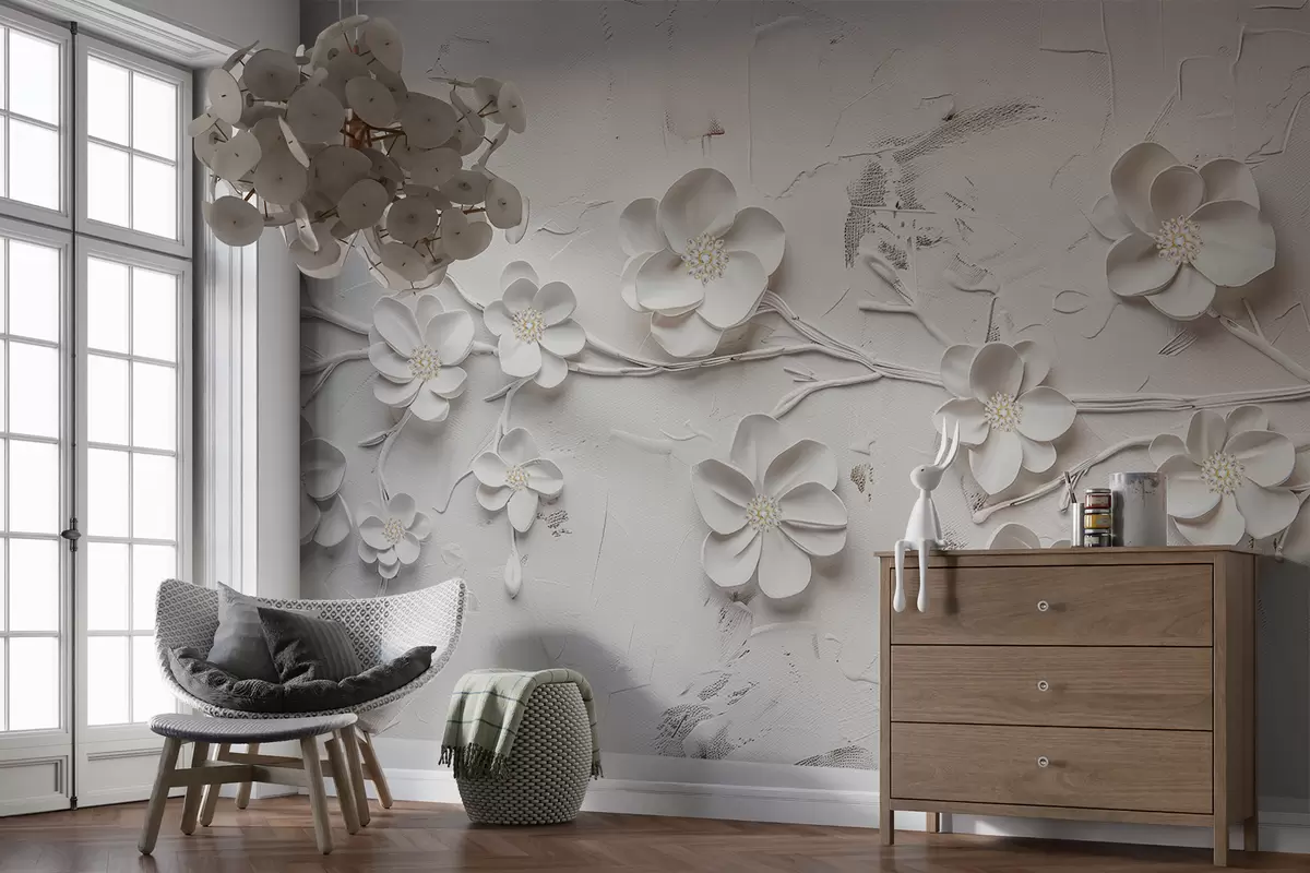 Papier peint photo Fond texturé blanc avec des fleurs blanches 3D en pleine floraison, reliées par des branches, minimaliste et élégante N° w01226