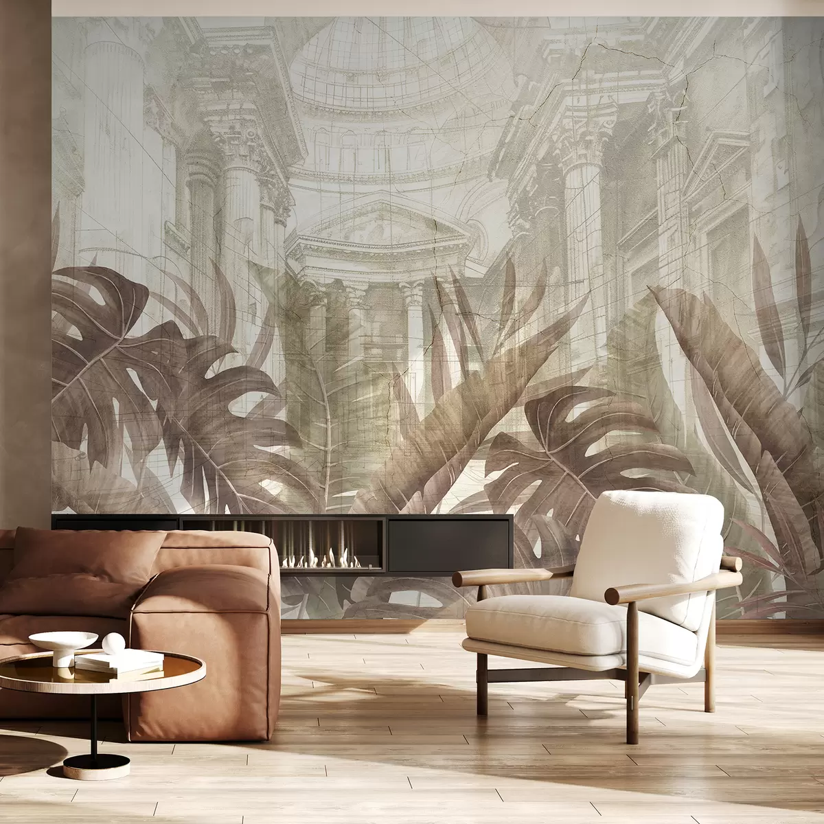 Papier peint photo Un grand dessin de colonnes architecturales en marbre ornées et de plantes tropicales sépia luxuriantes N° w01311v1