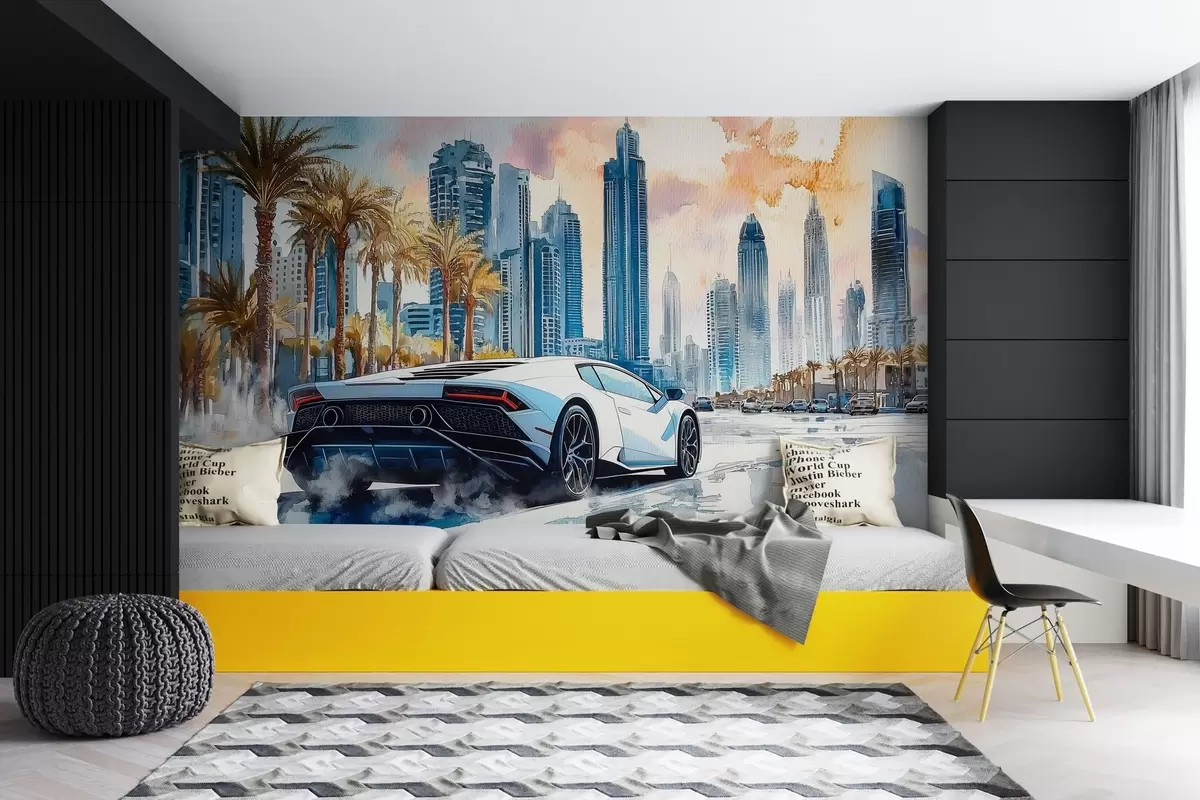 Papier peint photo Une voiture de sport moderne blanche roulant sur fond de palmiers et de gratte-ciel en technique d'aquarelle libre N° w01963