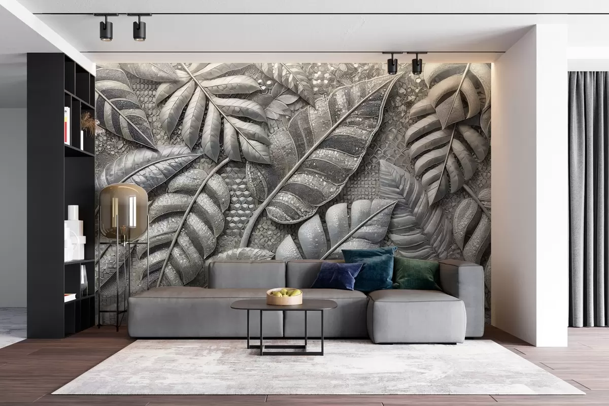 Papier peint photo Grandes feuilles tropicales dans des tons argentés délicats, dans un style mosaïque texturé N° w02135