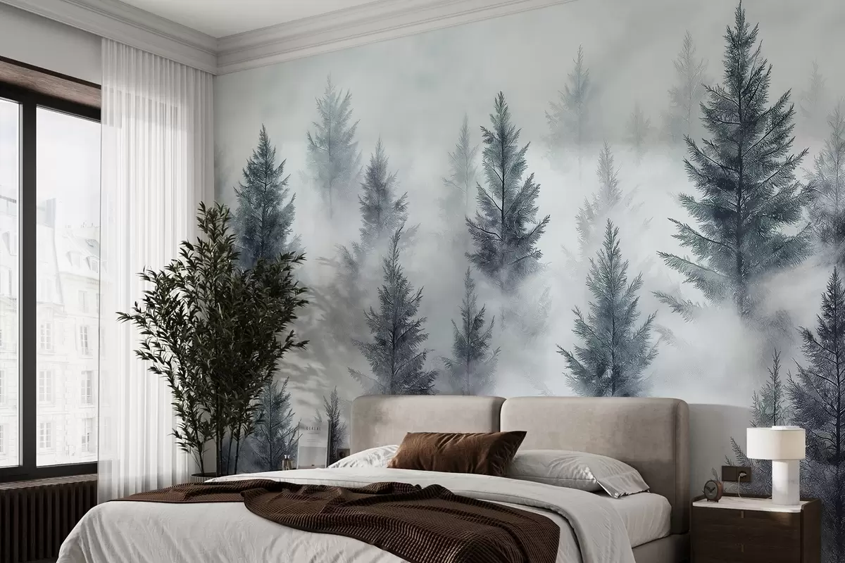 Papier peint photo Belle forêt avec pins, brouillard, paysages de nature, couleurs grises N° w02222v2