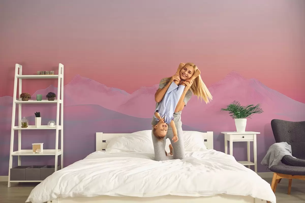 Papier peint photo Coucher de soleil doux et framboisé sur fond de montagnes et de ciel N° w02234