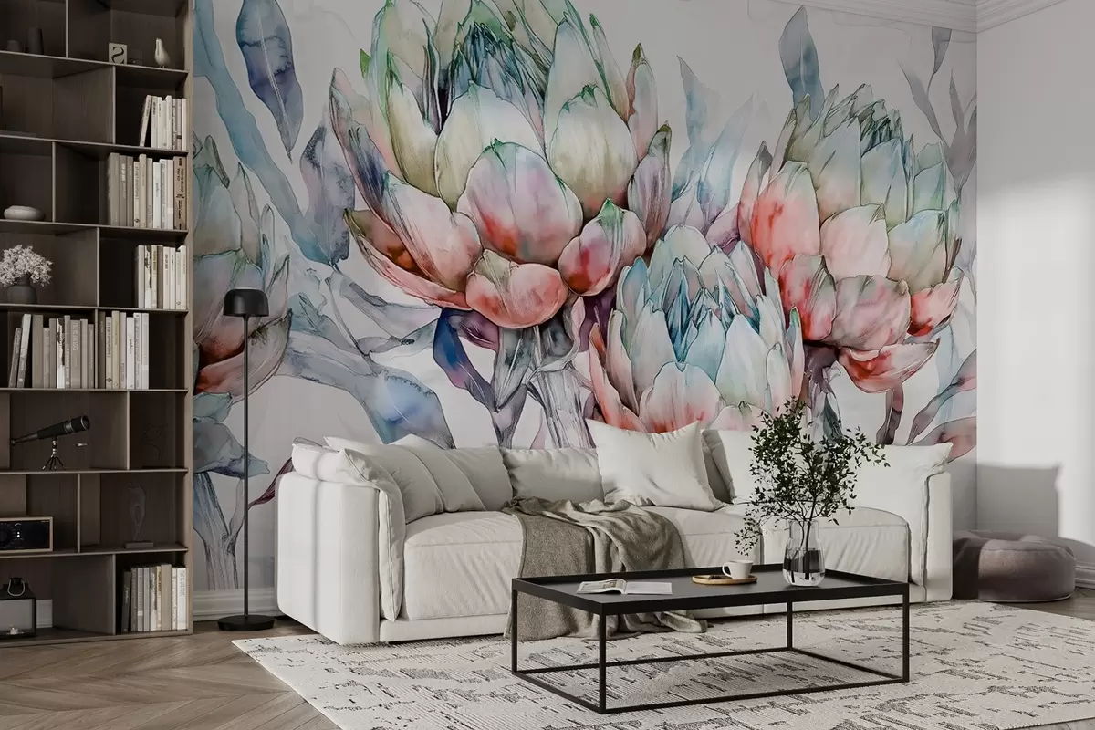 Papier peint photo Dessin d'artichauts, style aquarelle, floral, rouge, violet, vert N° w02484v1