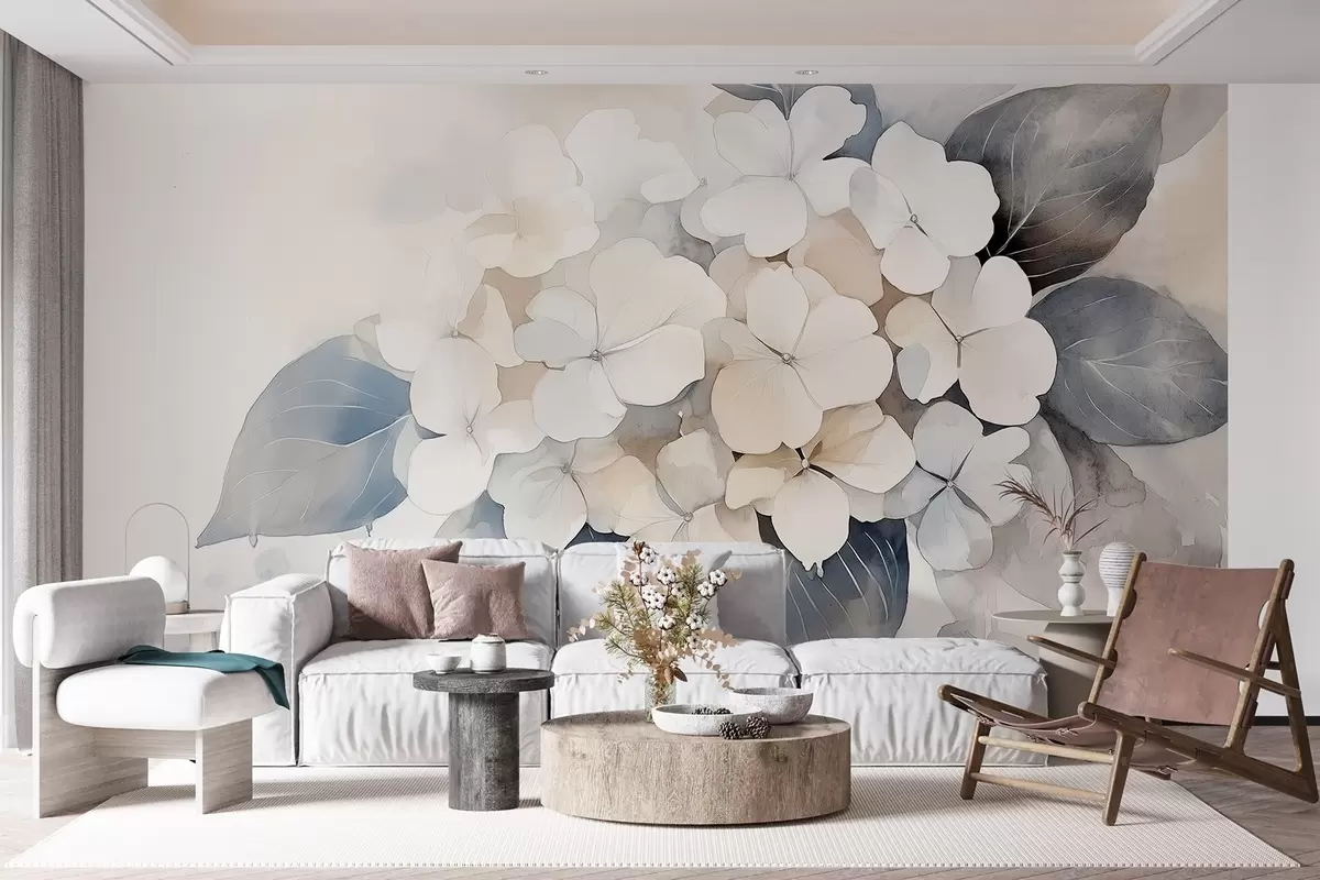 Papier peint photo Fleur d'hortensia, couleurs douces, style aquarelle N° w02491