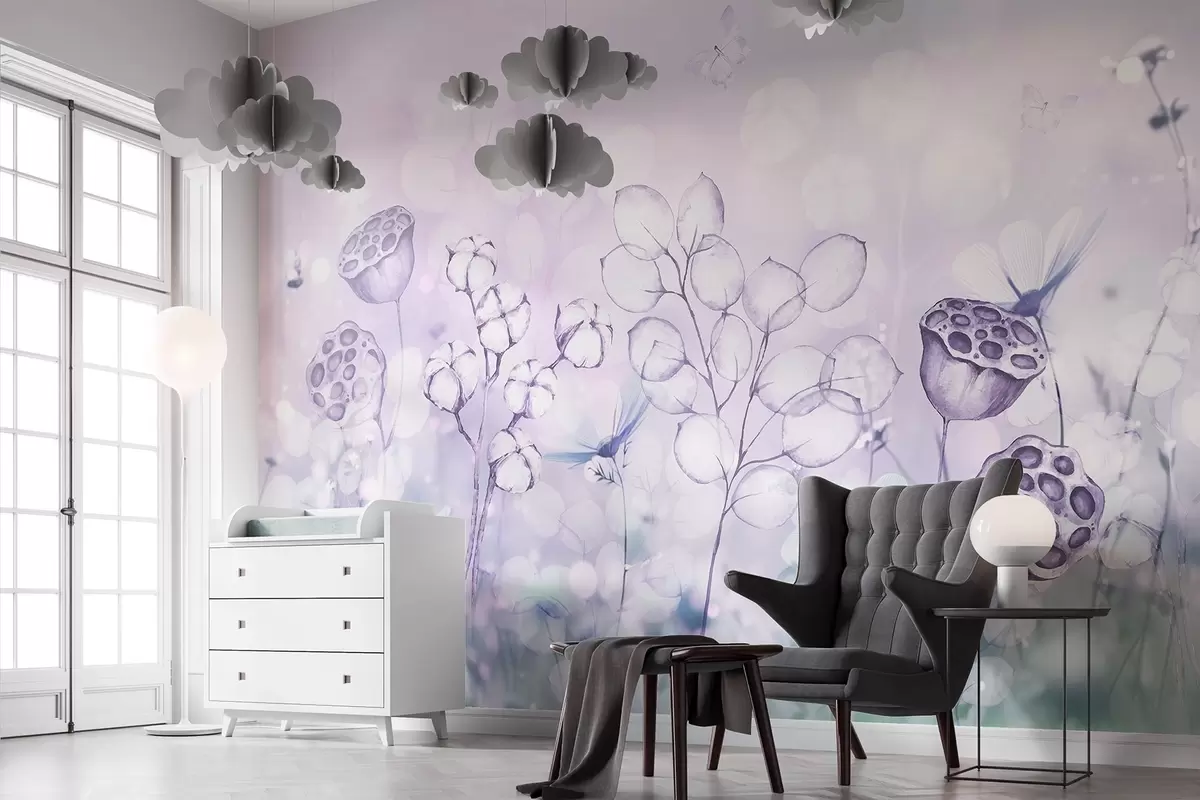 Papier peint photo Jardin de fleurs de rêve, papillon, fleurs de coton, lotus, couleurs violettes N° w02516v1