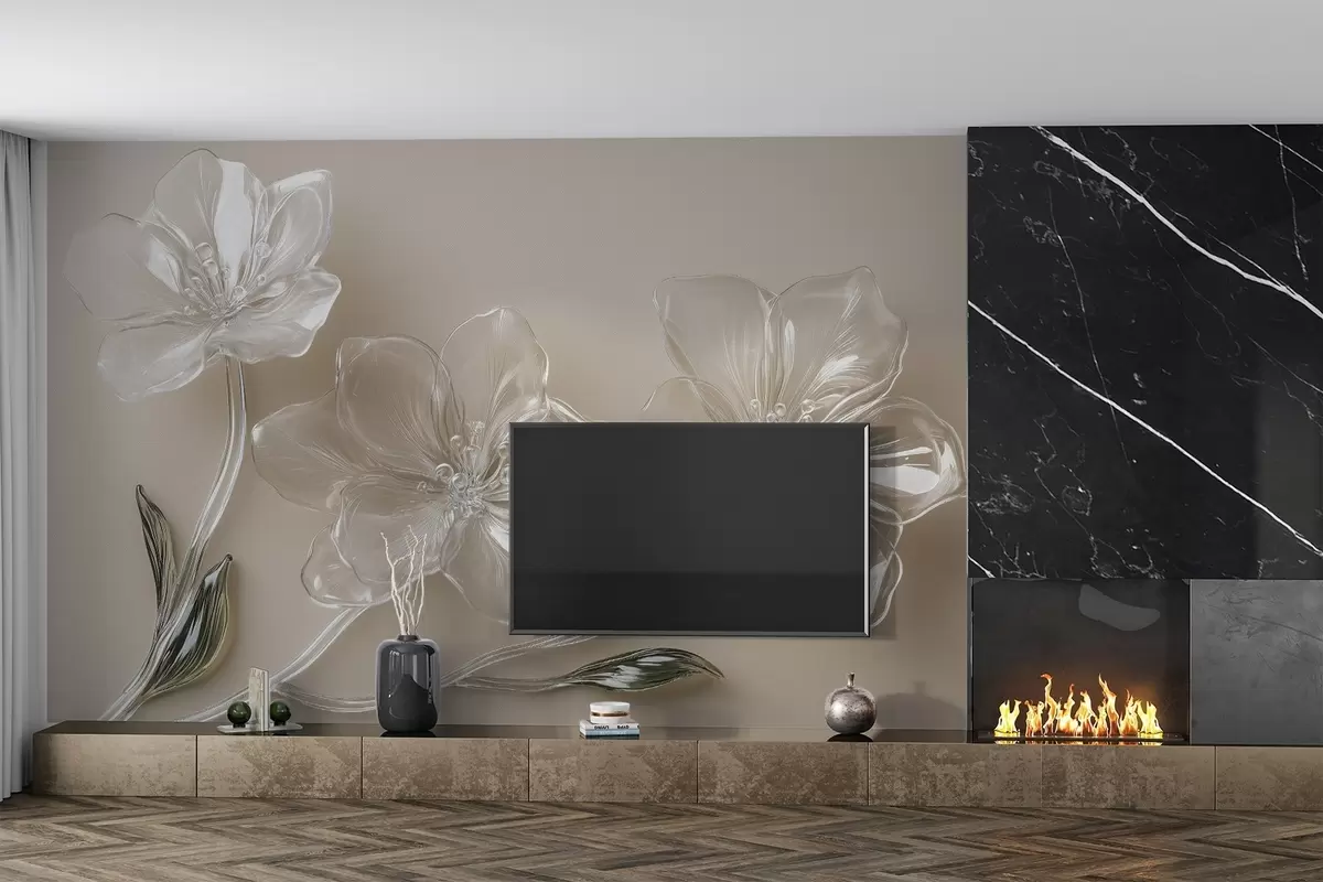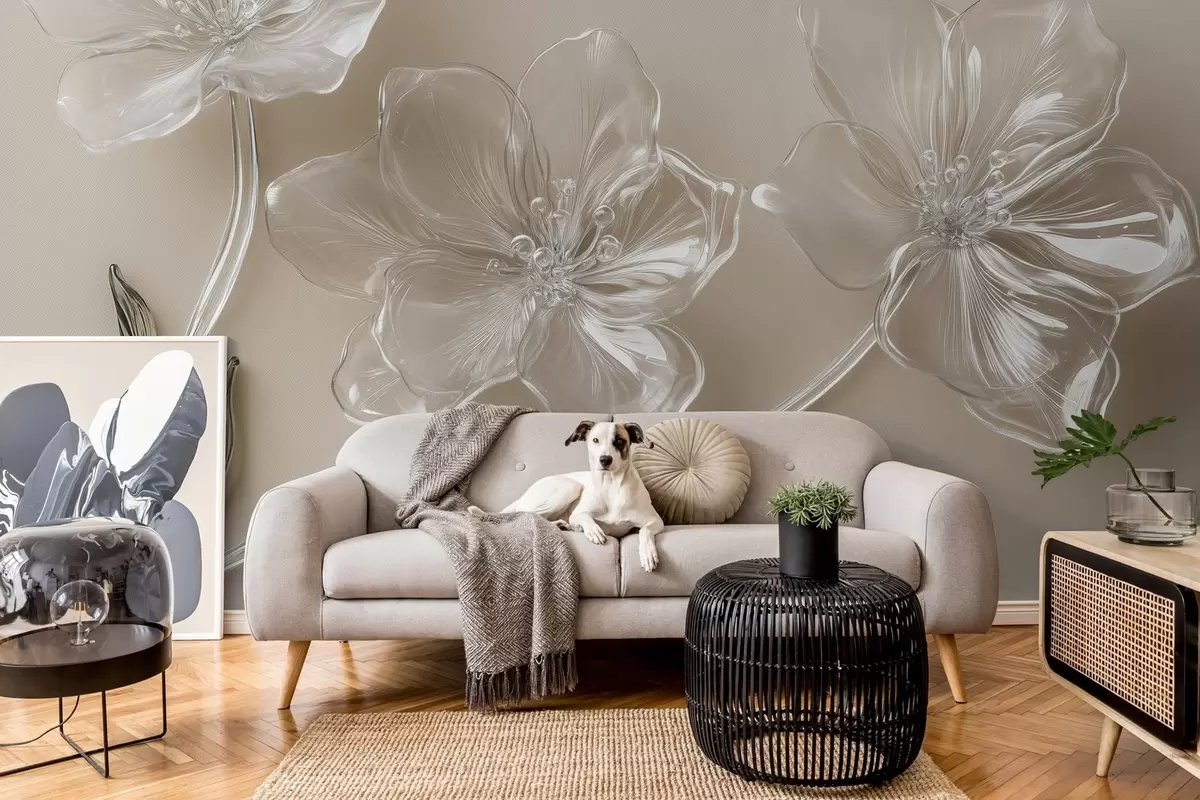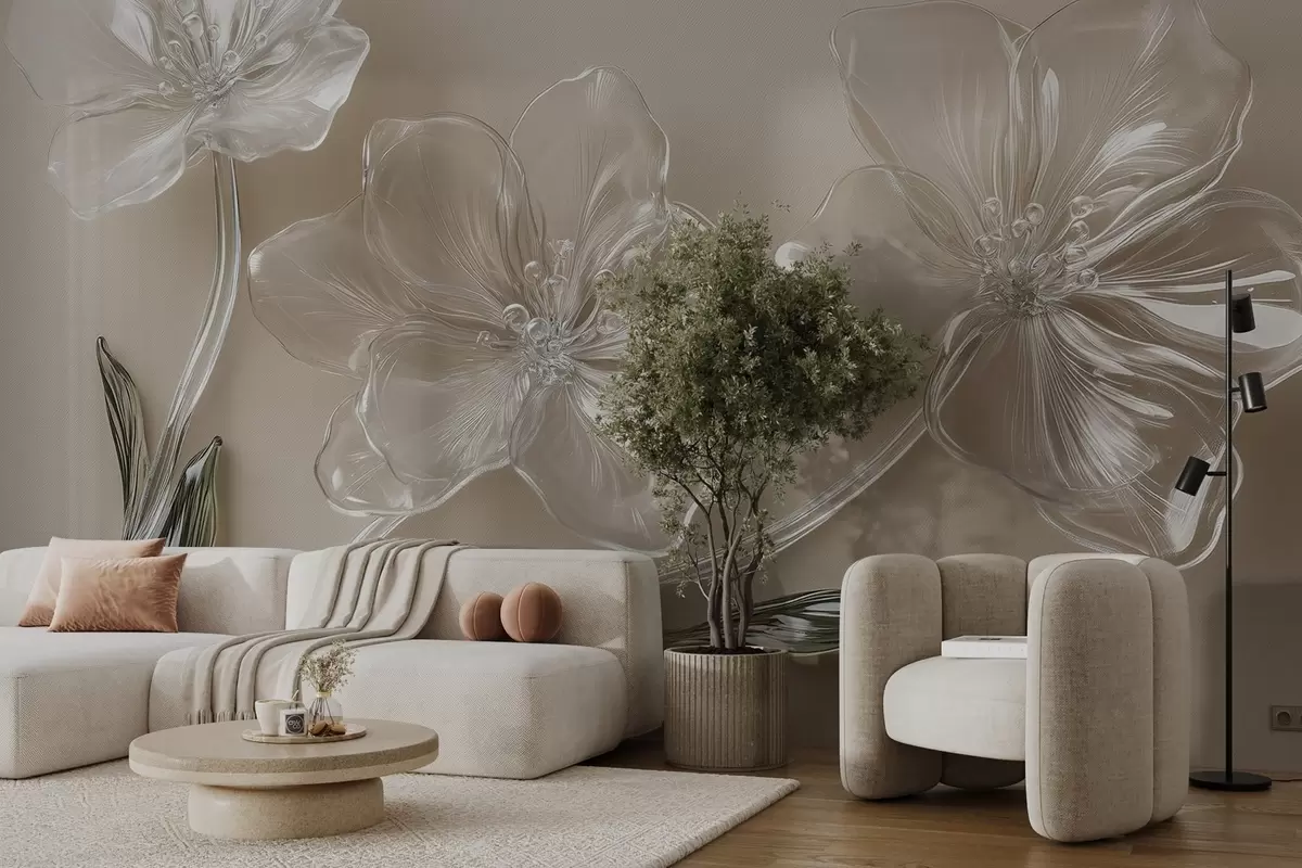 Papier peint photo grandes fleurs imitation verre sur fond beige N° w02518