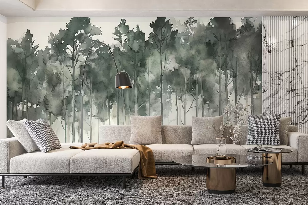 Papier peint photo Forêt de style aquarelle, pins, paysage de nature, couleurs vertes N° w02937
