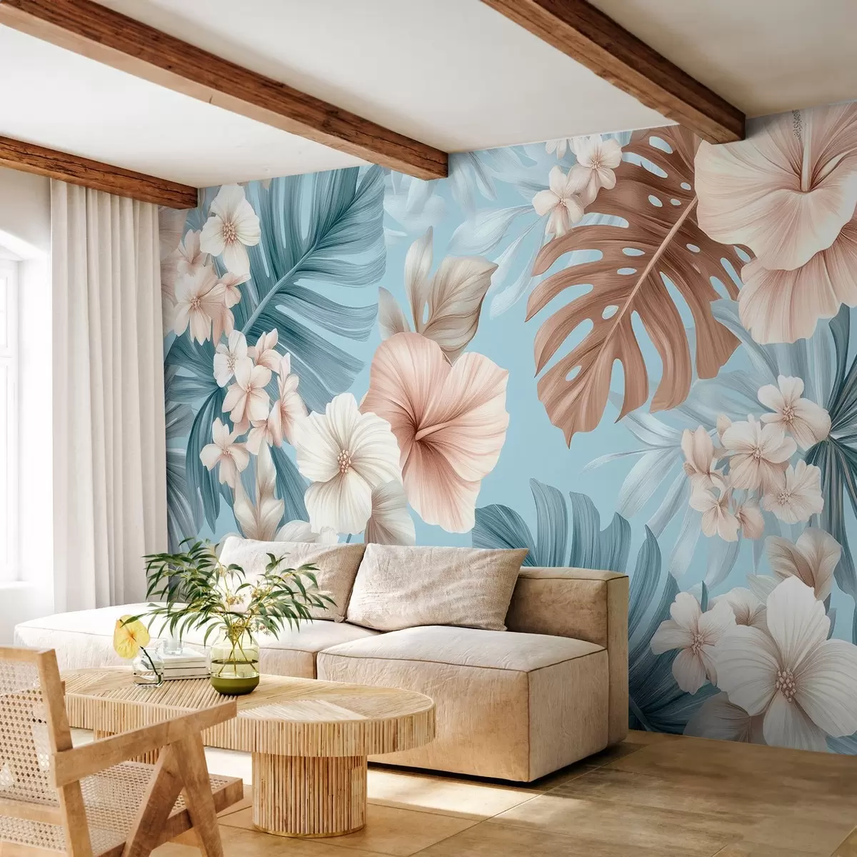 Papier peint photo imprimé tropical avec de grandes feuilles et des fleurs dans des tons bleu pastel et beige N° w03013