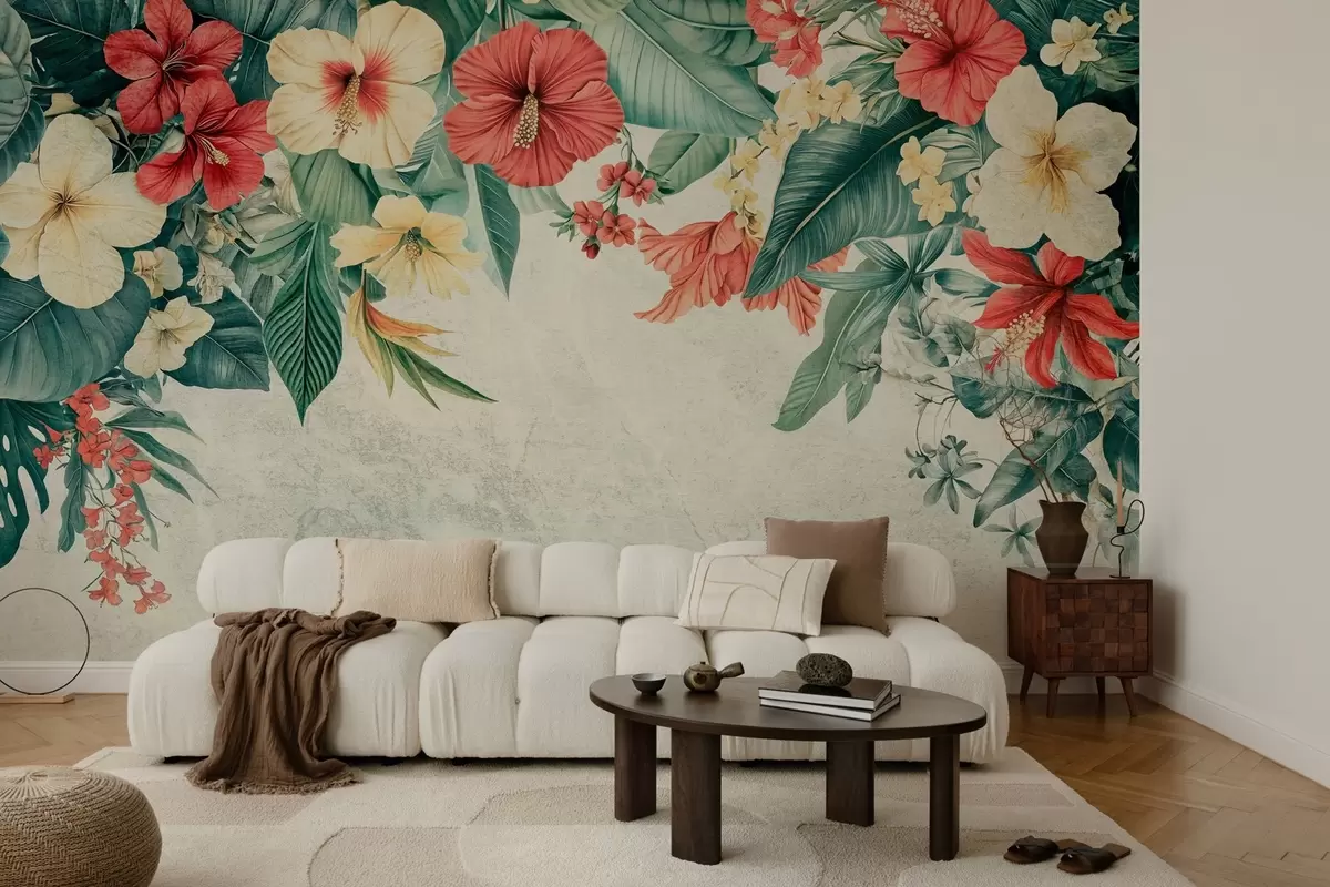 Papier peint photo fleurs et plantes tropicales suspendues sur un fond texturé N° w03023