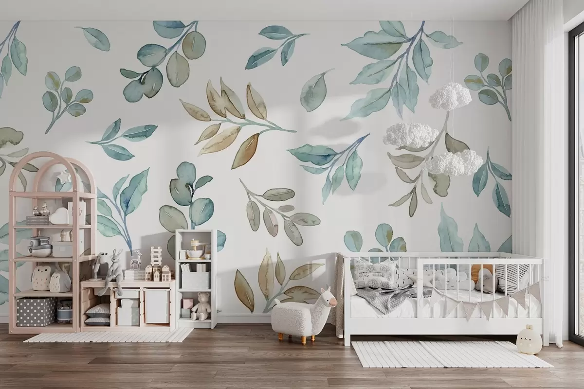 Papier peint photo diverses feuilles et branches en technique d'aquarelle dans les tons bleus et beiges sur fond blanc N° w03280