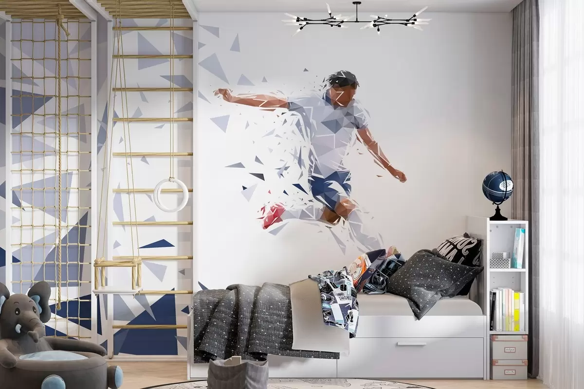 Papier peint photo Footballeur dynamique dans un style low-poly, frappant le ballon N° w03289