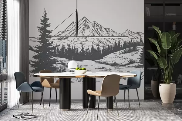 Papier peint photo Paysage de montagnes avec pins, forêt, nature, couleur gris foncé N° w03344