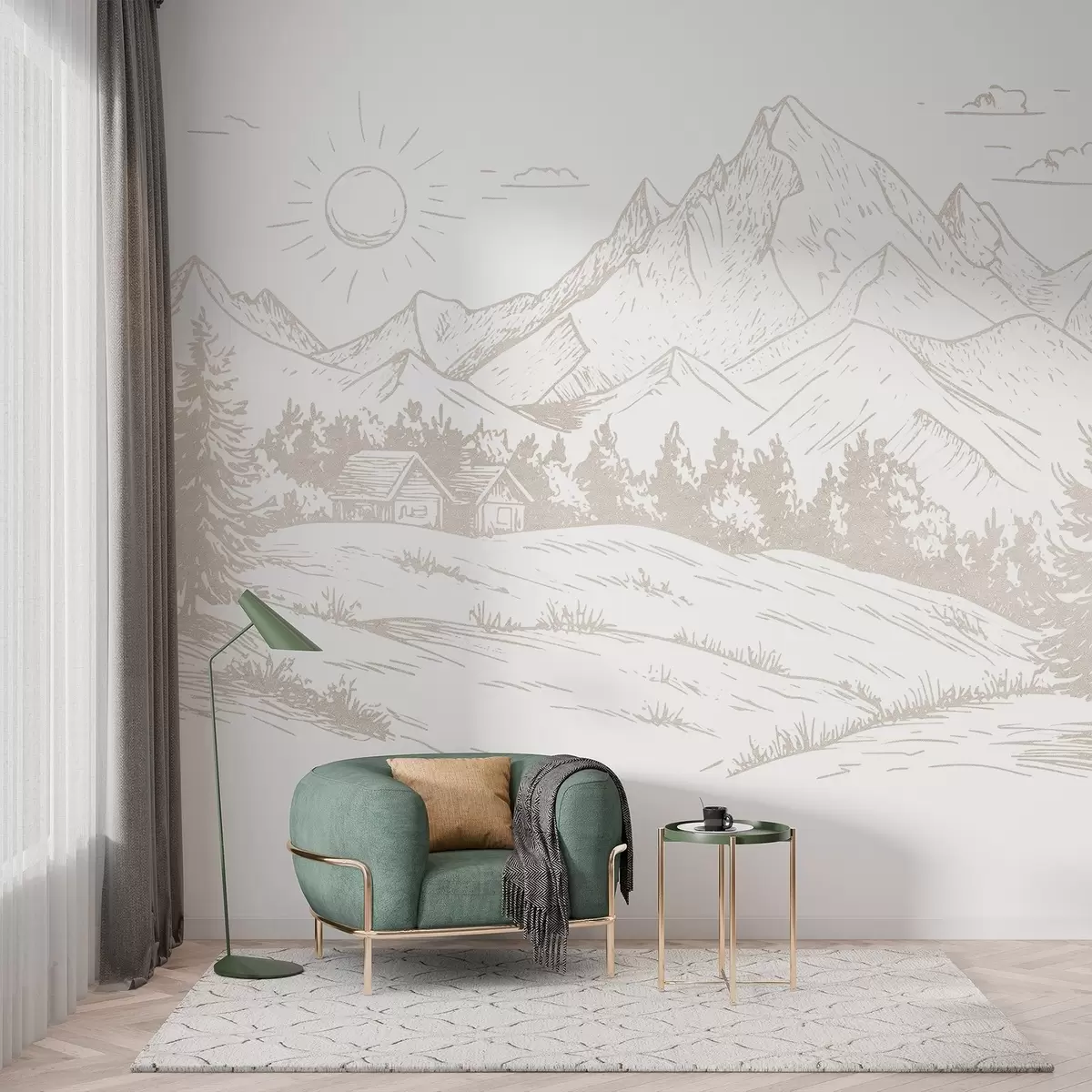 Papier peint photo Dessin de montagnes, paysages de nature, forêt, maisons en bois, couleur beige N° w03348