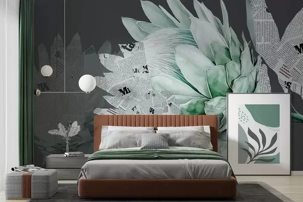 Papier peint photo Protea flowers, newspaper art, floral, tropical, dark background, green colors N° w03667v3