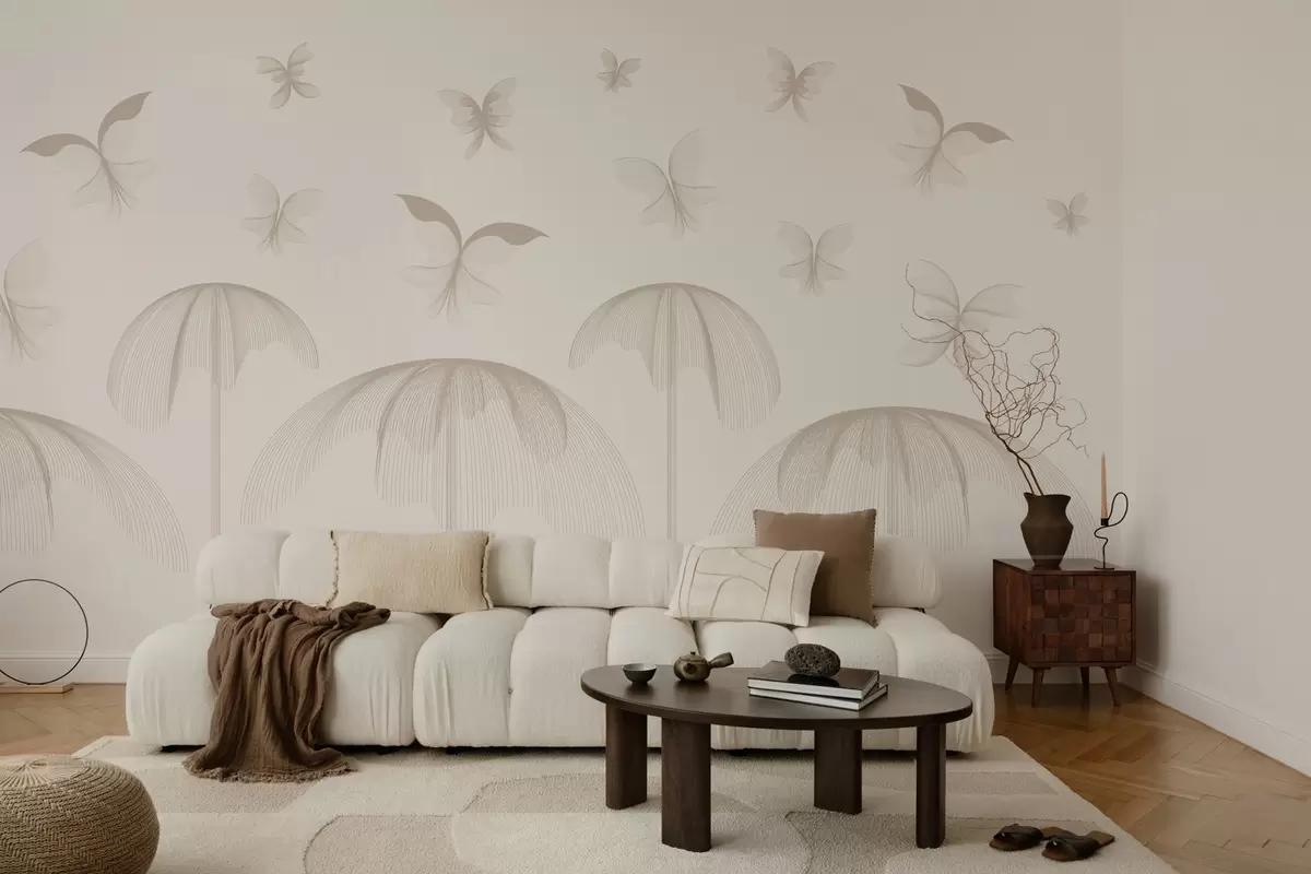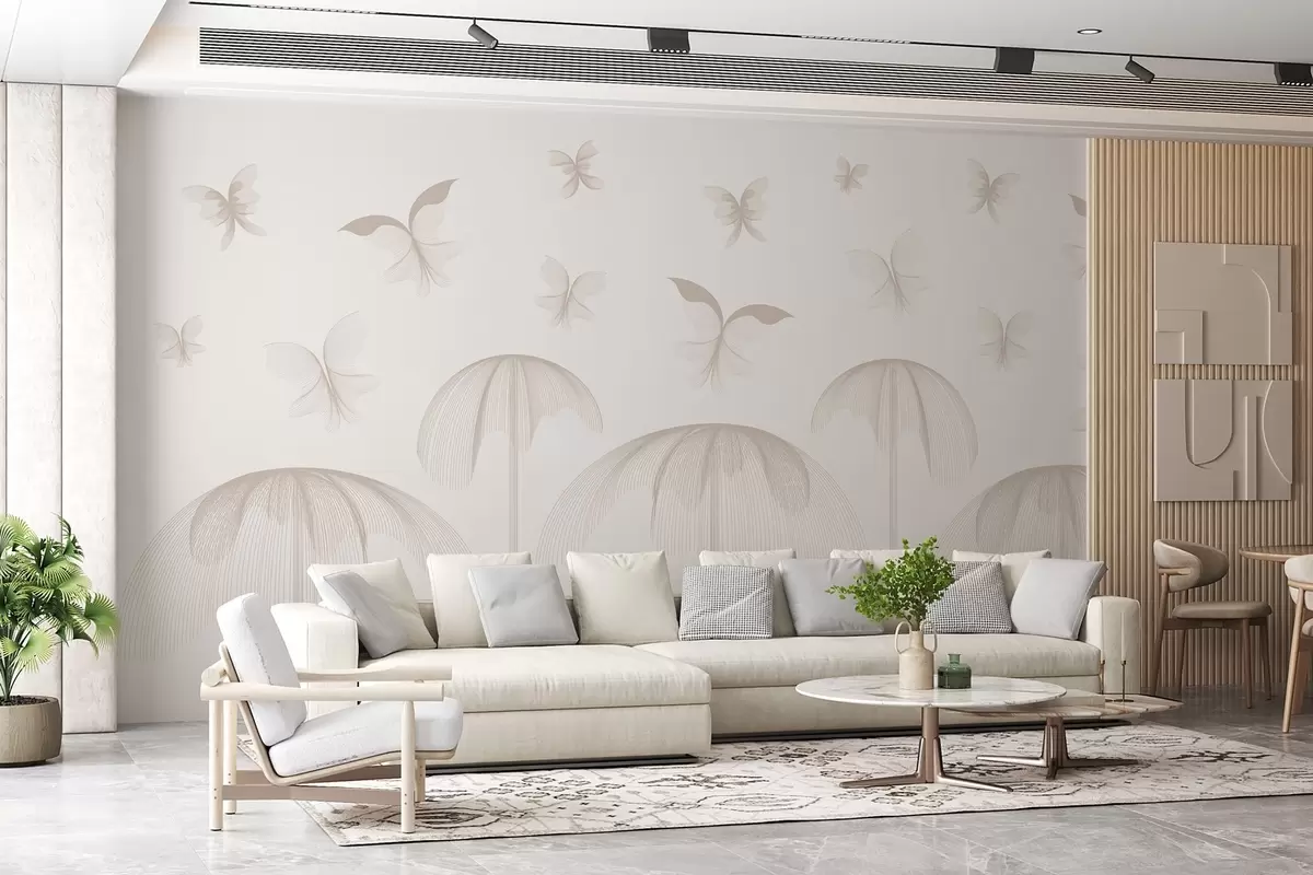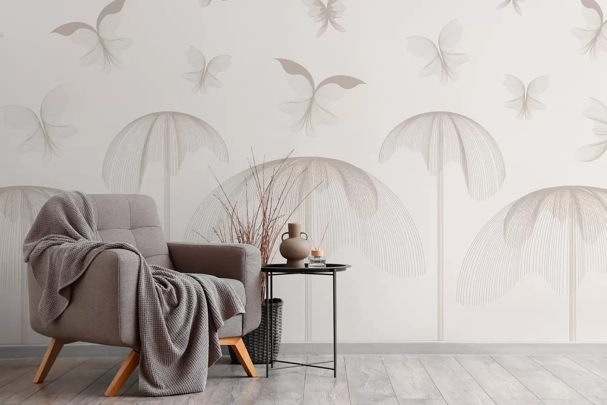 Papier peint photo papier peint linéaire minimaliste avec papillons et fontaines sur fond laiteux N° w03762