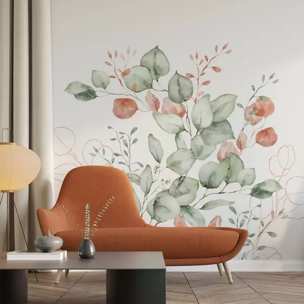 Papier peint photo Végétation et branches imitation aquarelle texturée, nuances de vert et de rouge N° w03927v1