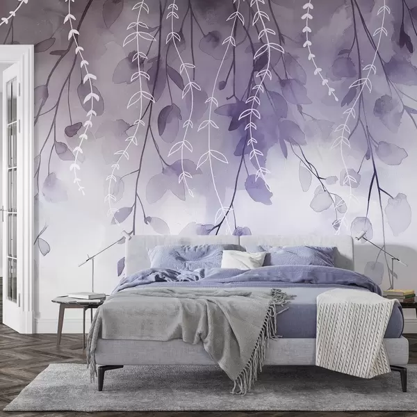 Papier peint photo Branches et feuilles en style aquarelle, couleurs violettes naturelles N° w04007v2