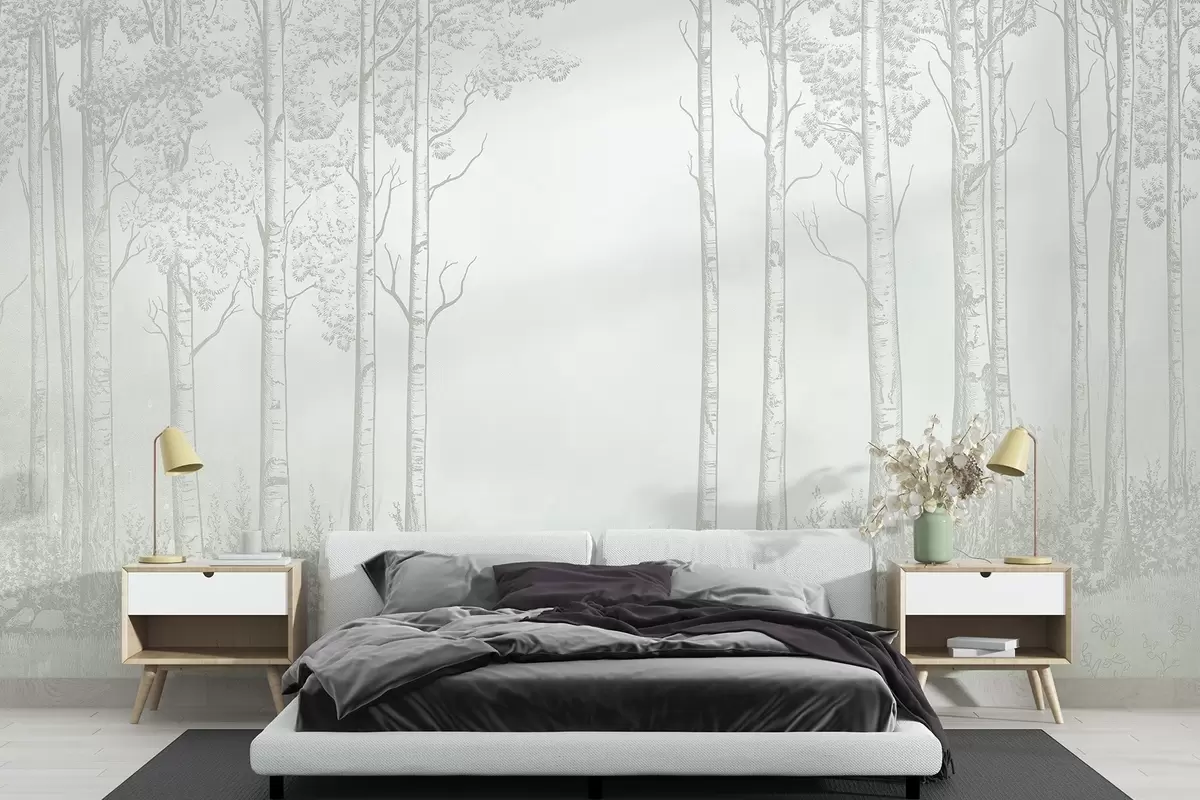 Papier peint photo Forêt avec bouleaux, minimalisme, nature, palette de couleurs vertes N° w04009v1