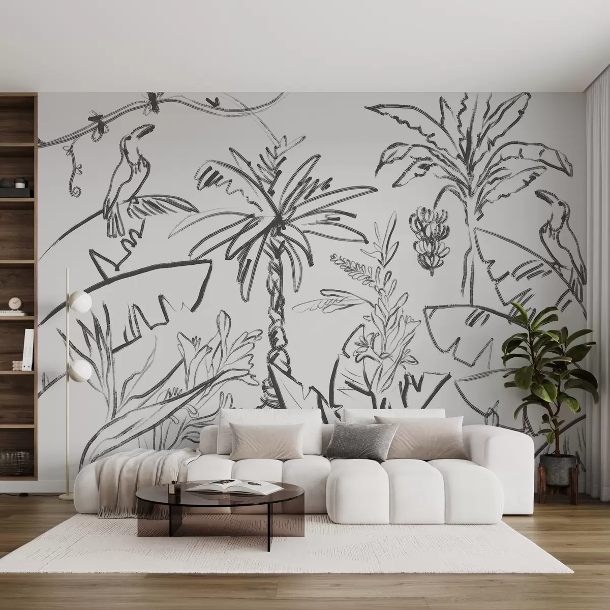 Papier peint photo Dessin au trait tropical, bananes, palmiers, graphiques de contour N° w04020