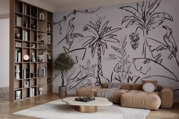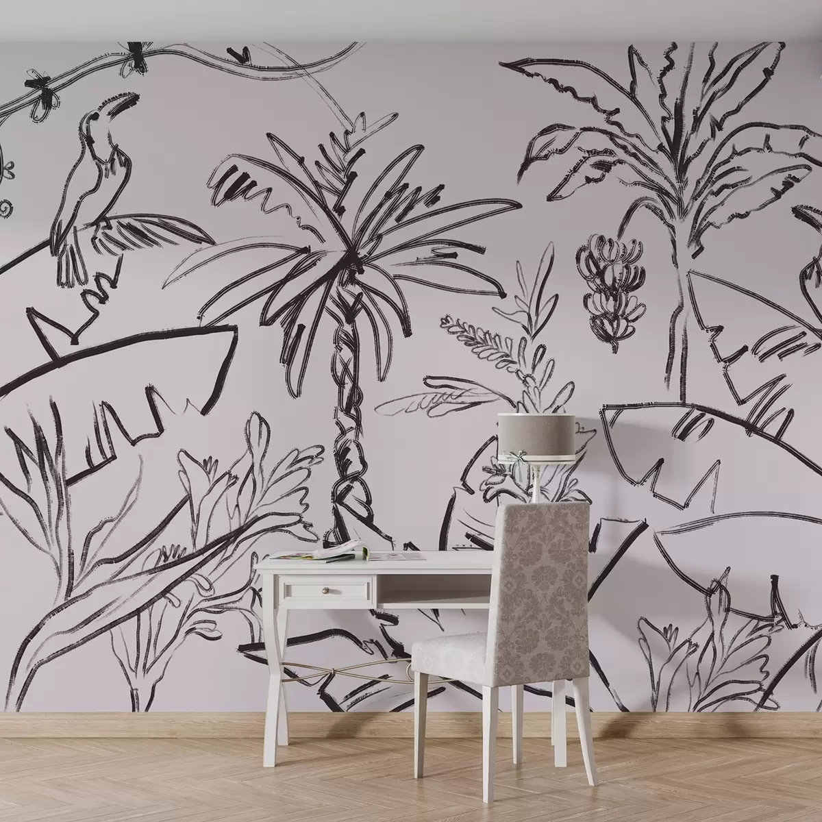 Papier peint photo Motif tropical en noir, palmiers, bananes, graphiques de contour N° w04020v7