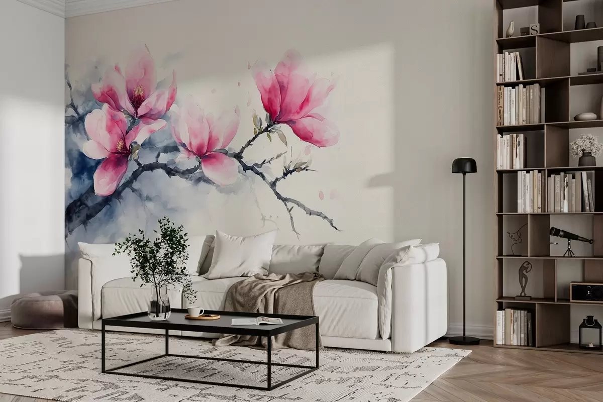 Papier peint photo branche fleurie de magnolia rose sur fond ivoire N° w04027