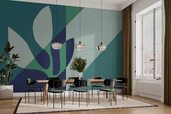 Papier peint photo plante graphique abstraite sur fond de géométrie dans les tons bleus N° w04028v1