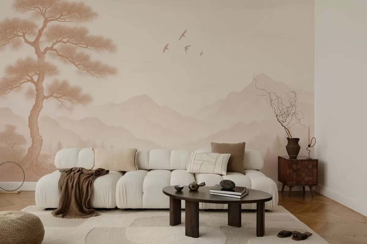 Papier peint photo panorama de collines avec un grand arbre dans les tons moka N° w04033v1