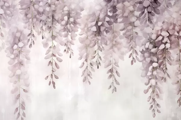 Papier peint photo Scène aquarelle douce dans des tons rose crème, avec des grappes de glycines en cascade formant un rideau floral de rêve N° w04034v2