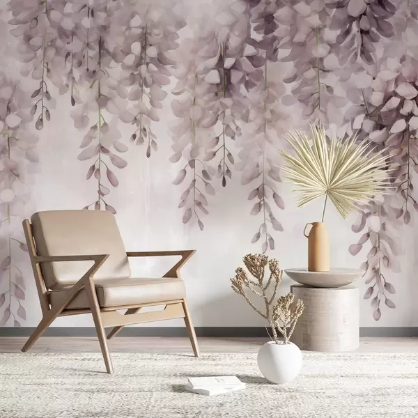 Papier peint photo Scène aquarelle douce dans des tons rose crème, avec des grappes de glycines en cascade formant un rideau floral de rêve N° w04034v2