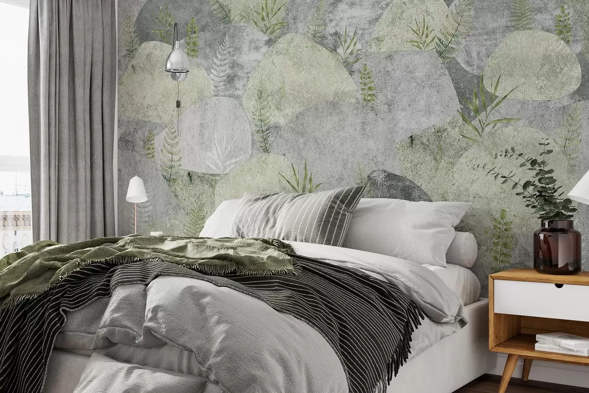 Papier peint photo Pierres avec plantes, fougères, style nordique, rustique, couleurs grises et vertes N° w04064v2
