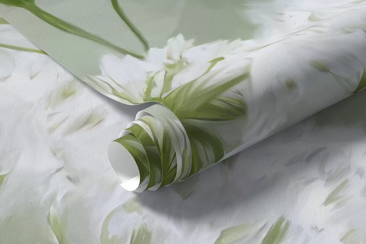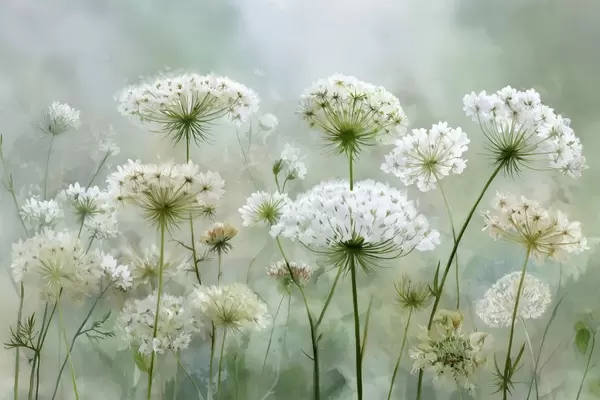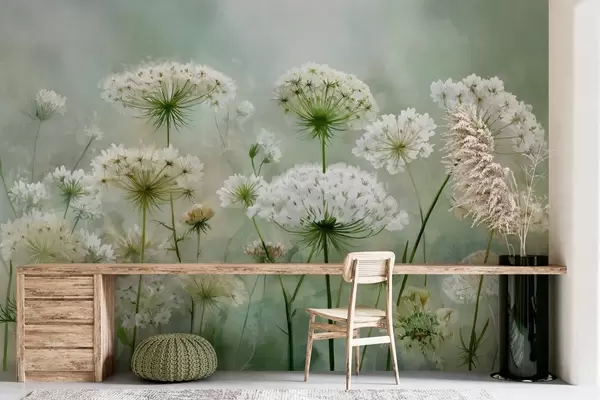 Papier peint photo délicates fleurs sauvages blanches Queen Anne, dans un style pittoresque, tons verts N° w04313