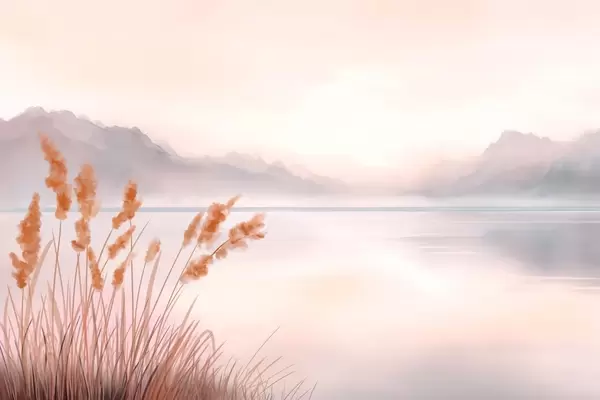 Papier peint photo un lac pittoresque avec des roseaux et des montagnes N° w04315