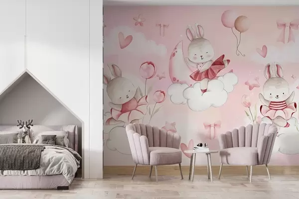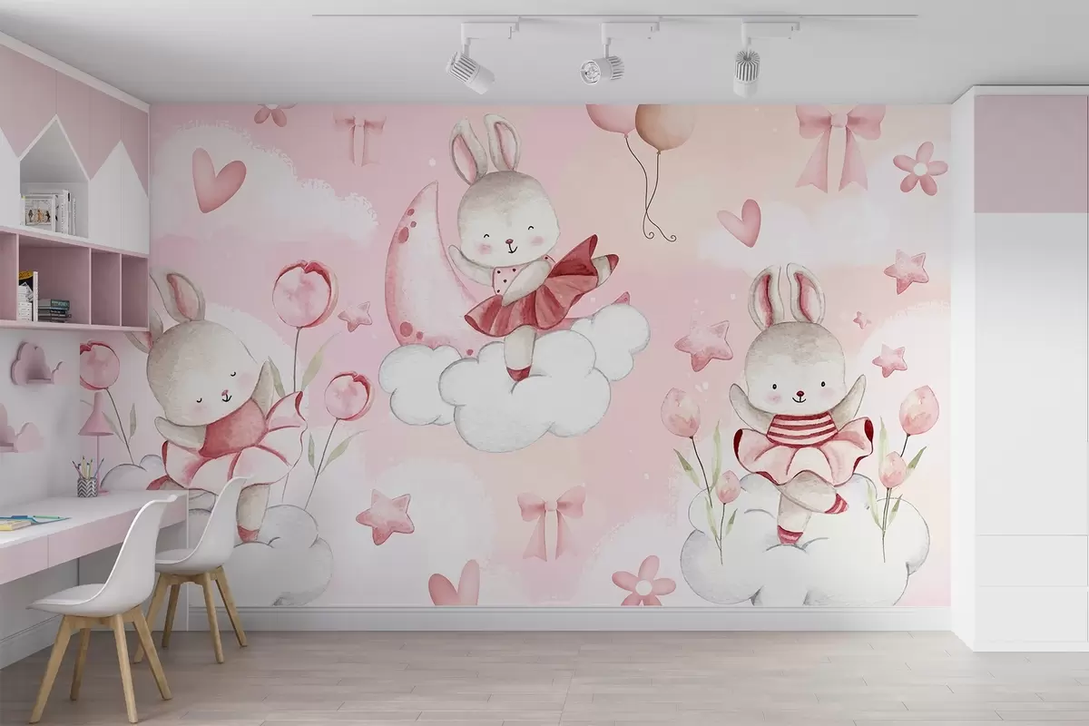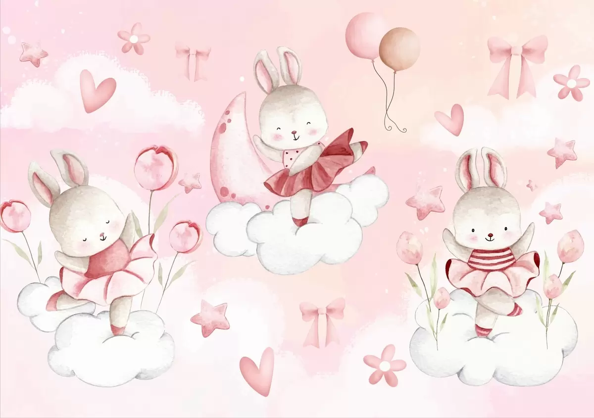 Papier peint photo Lapins en robes de ballet roses sur des nuages N° w04333