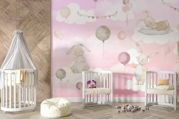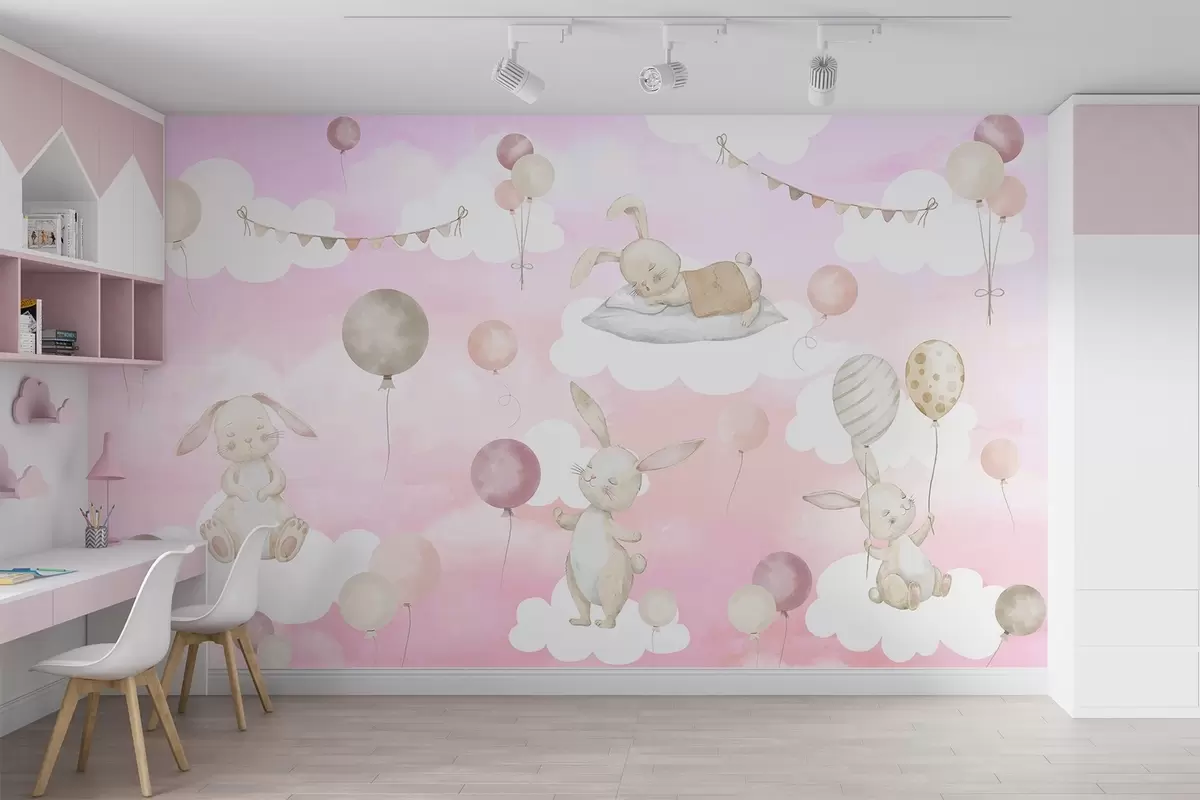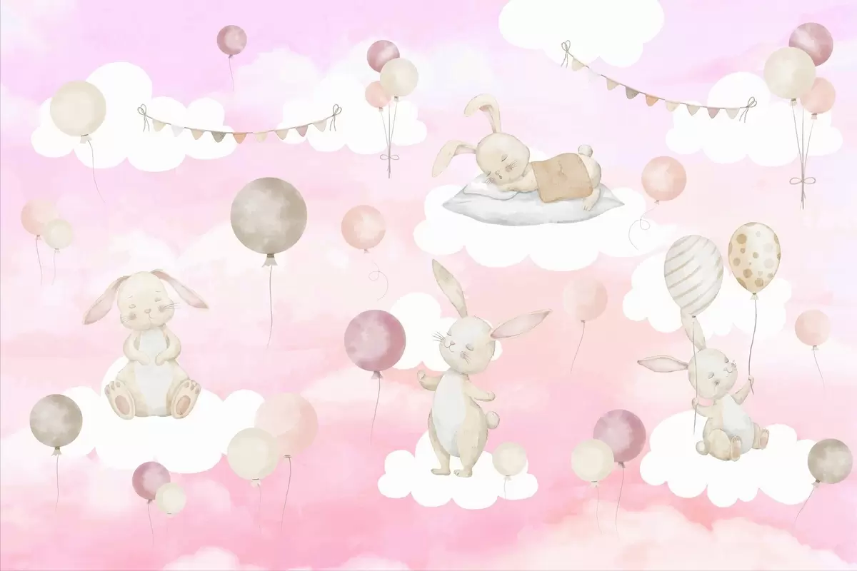 Papier peint photo Lapins avec des ballons sur des nuages N° w04337v1