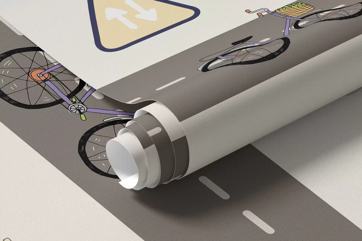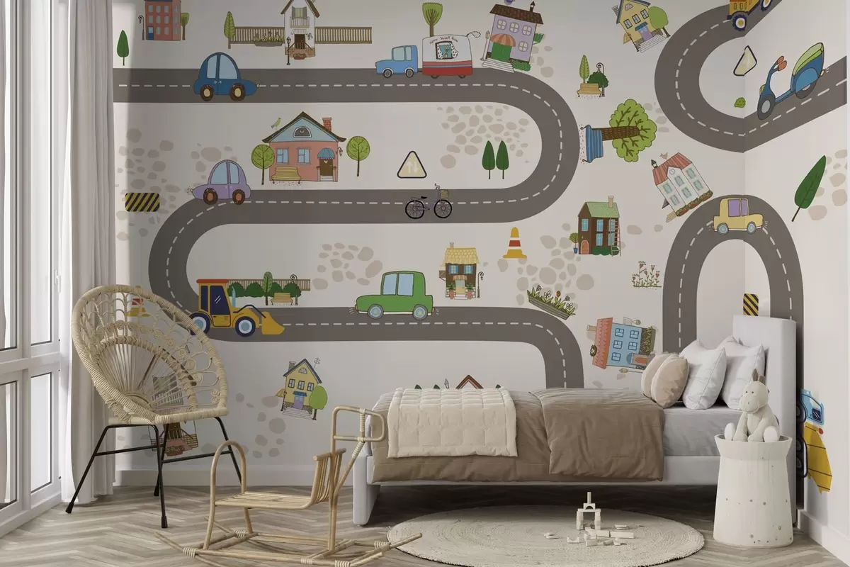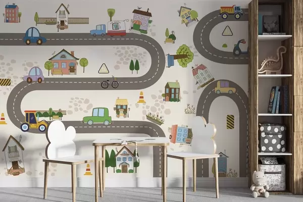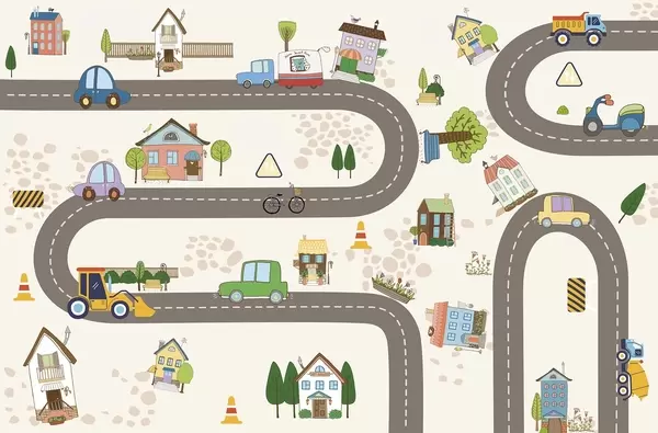 Papier peint photo Route pour enfants avec voitures et maisons colorées N° w04404