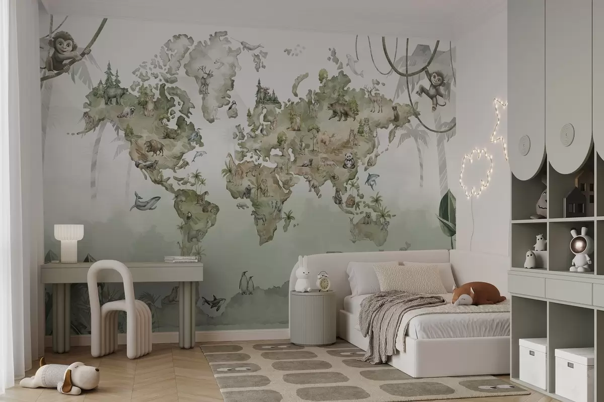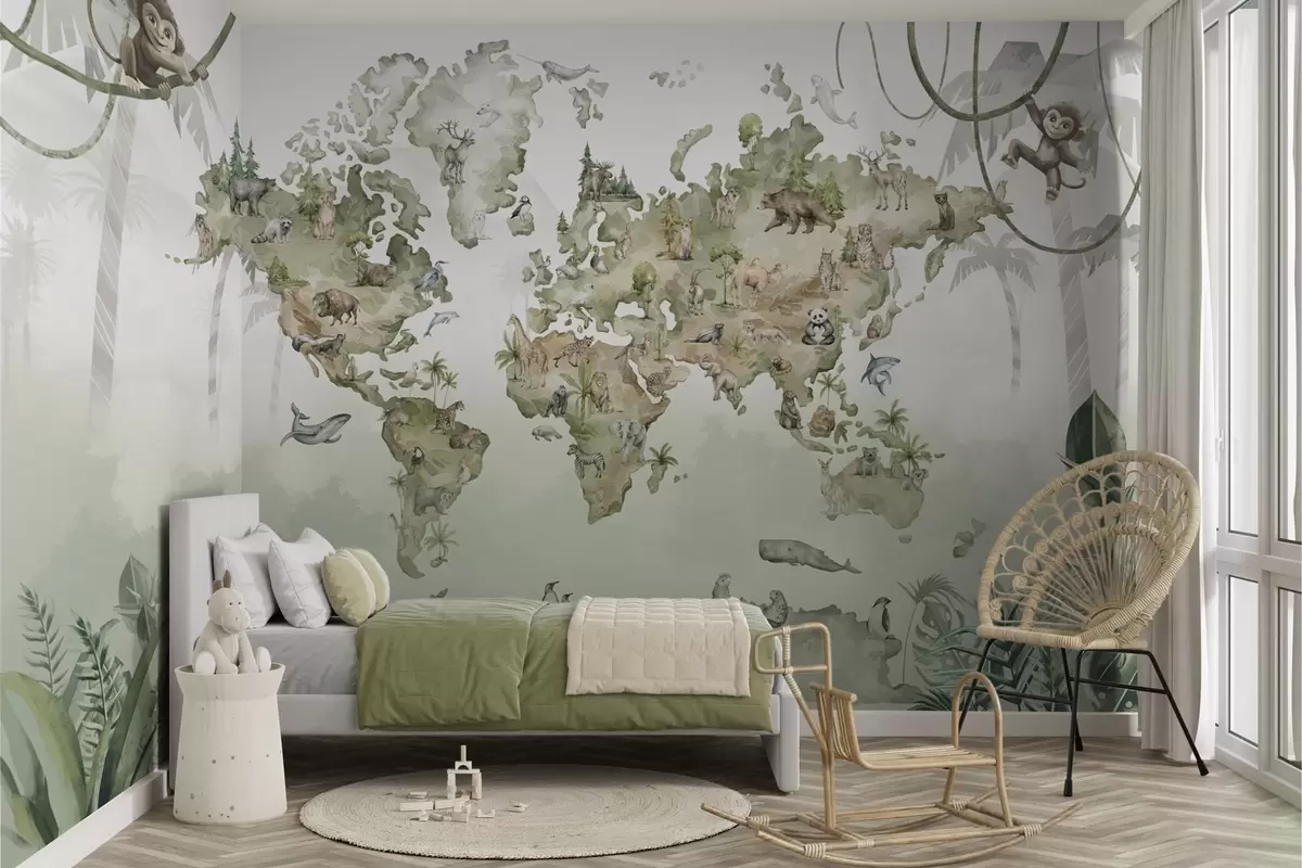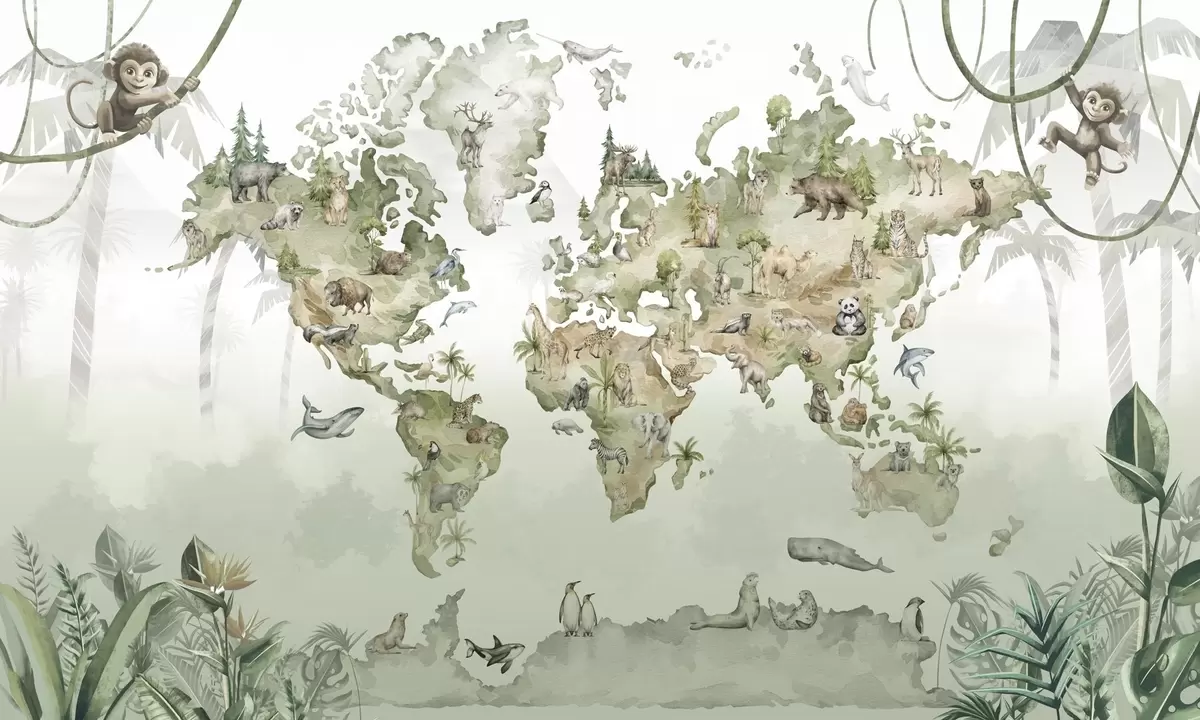 Papier peint photo Carte du monde illustrée avec des animaux et des jungles N° w04418v1