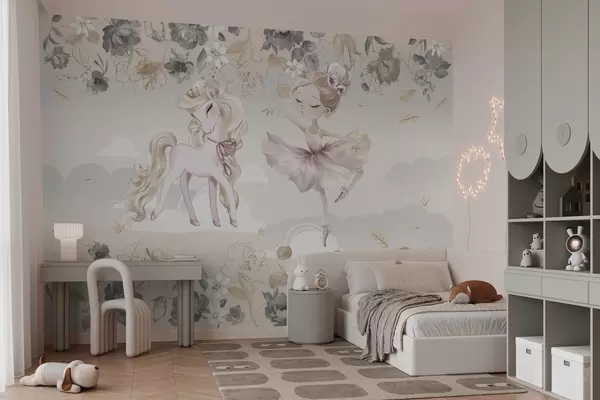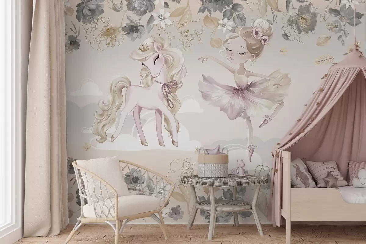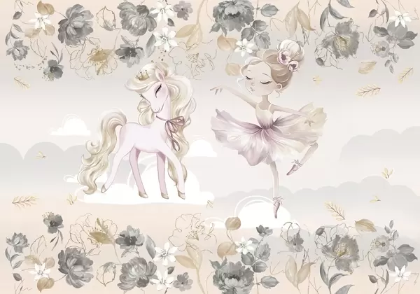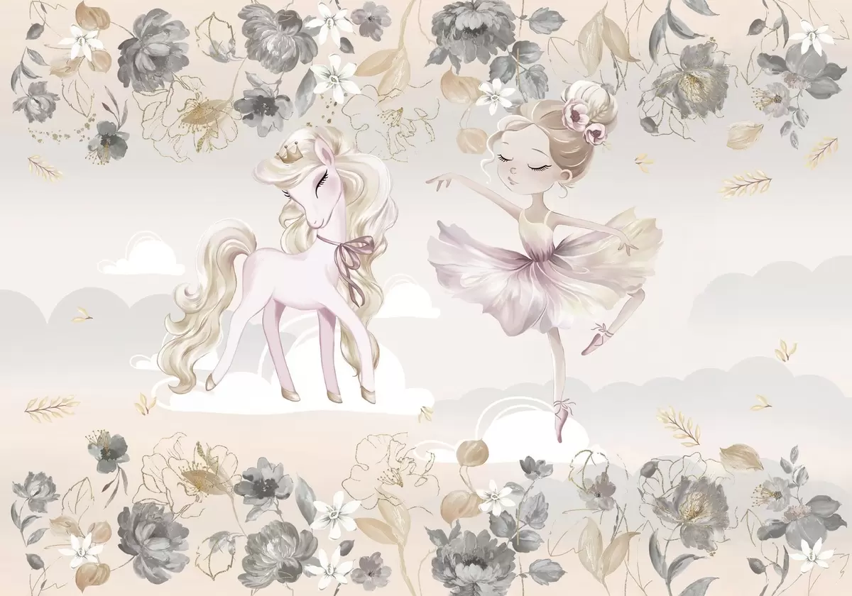 Papier peint photo Poney blanc comme neige et ballerine parmi les fleurs et les nuages N° w04419