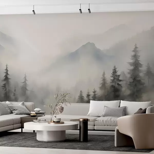 Papier peint photo Forêt dans le brouillard avec les montagnes en arrière-plan N° w04493