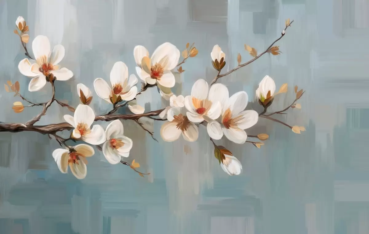 Papier peint photo Branche fleurie dans le style de la peinture à l'huile sur fond bleu N° w04496
