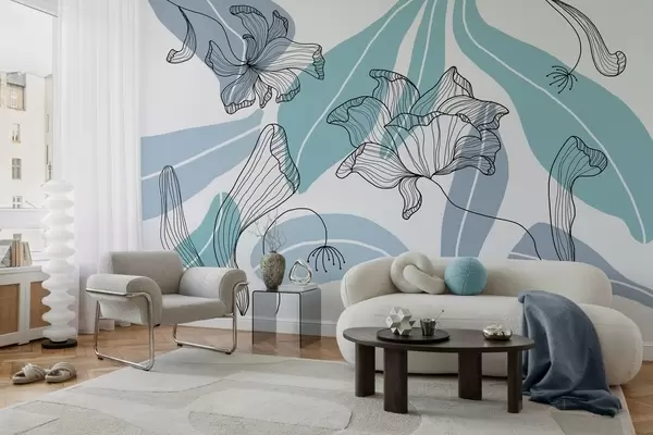 Papier peint photo feuilles et fleurs abstraites dans les tons bleus N° w04499v2