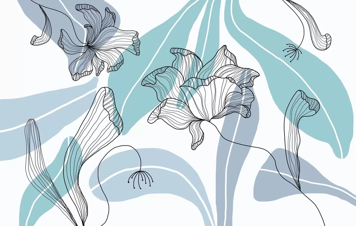 Papier peint photo feuilles et fleurs abstraites dans les tons bleus N° w04499v2