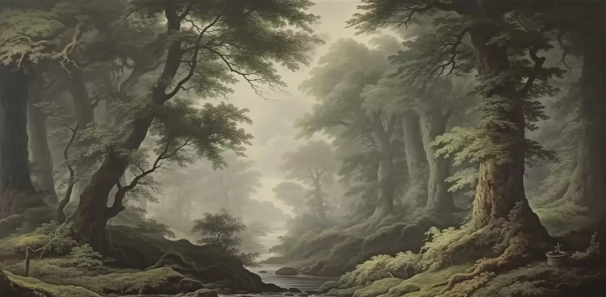 Papier peint photo Forêt brumeuse avec rivière et grands arbres anciens N° w04555