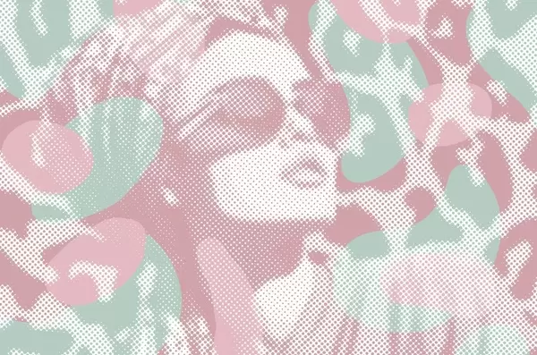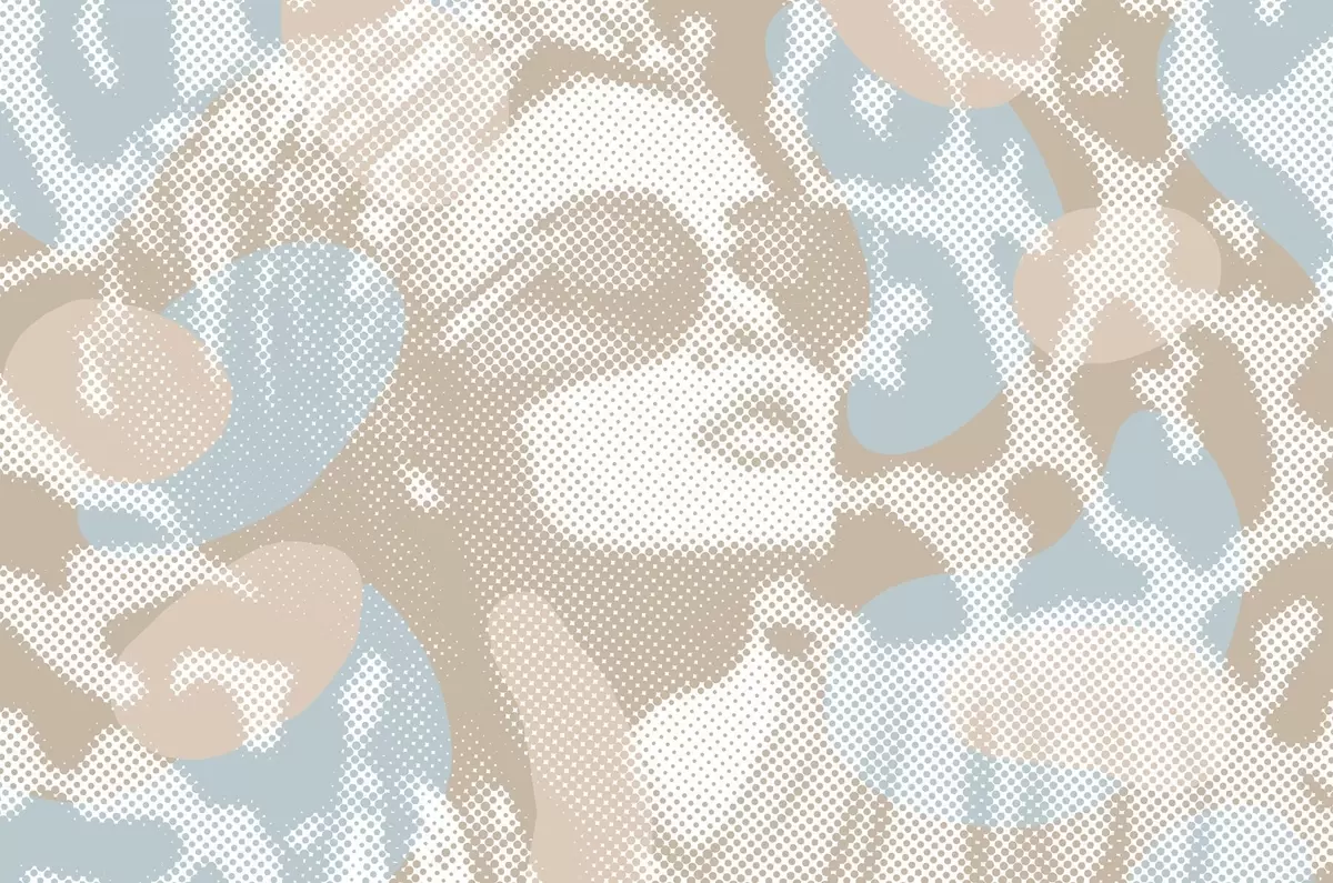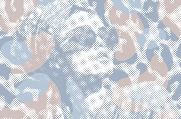Papier peint photo portrait d'une femme sur fond léopard dans un style pointillé dans des tons beiges et bleus N° w04630