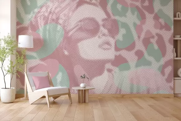 Papier peint photo portrait d'une femme sur fond léopard dans un style pointillé dans des tons roses et verts N° w04630v2