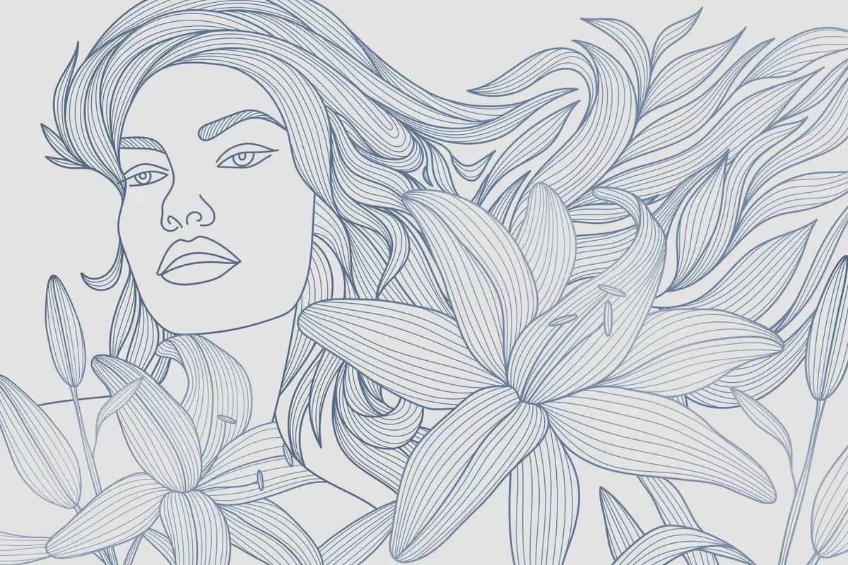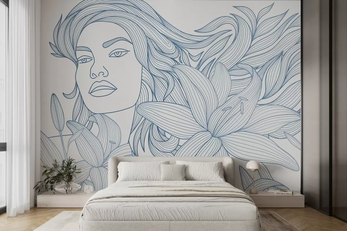 Papier peint photo Portrait d'une jeune fille dans des nuances de bleu et de fleurs de lys N° w04689v2