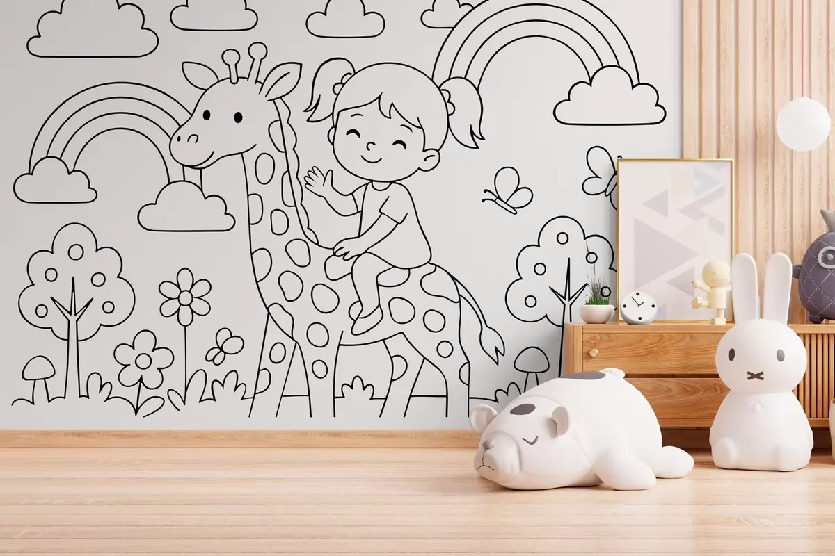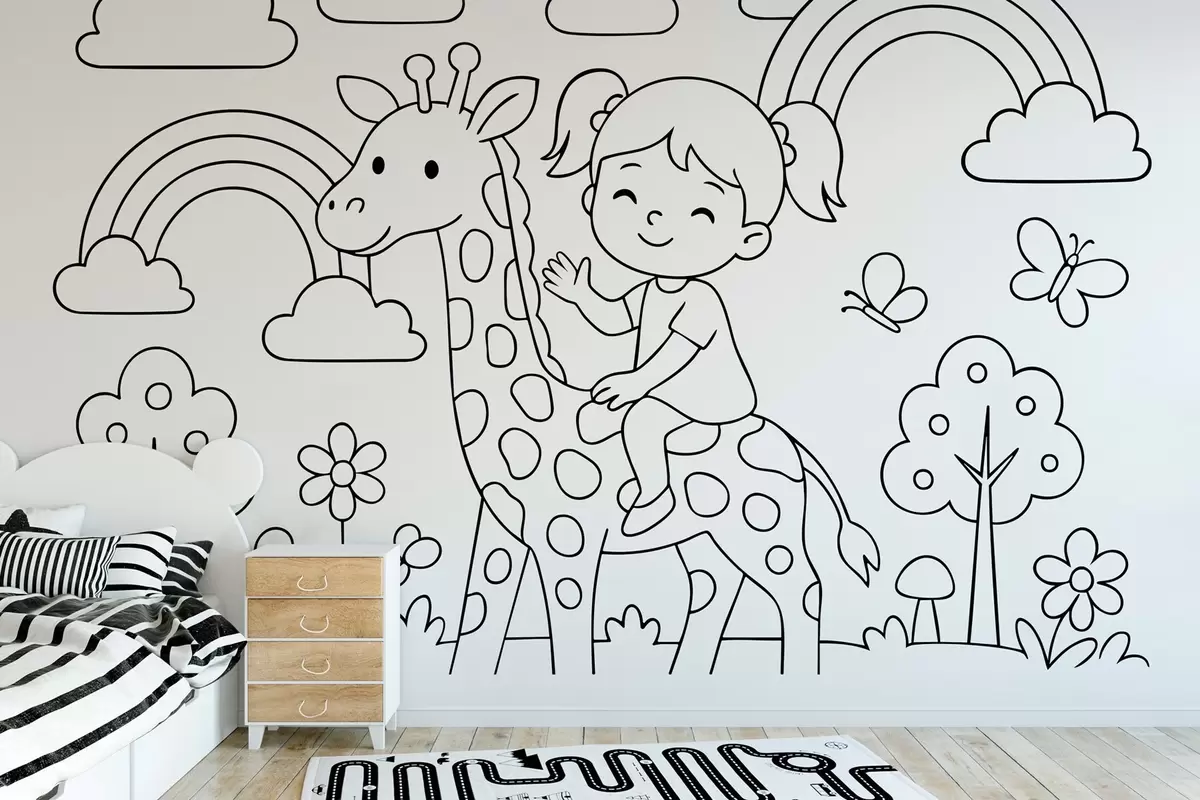 Papier peint photo dessin en noir et blanc d'une fille sur une girafe dans le style d'un livre de coloriage pour enfants N° w04753