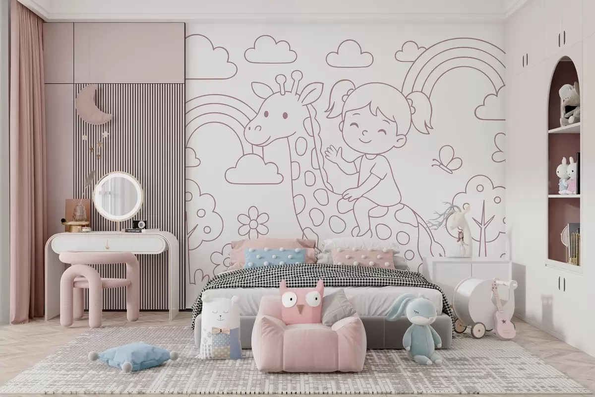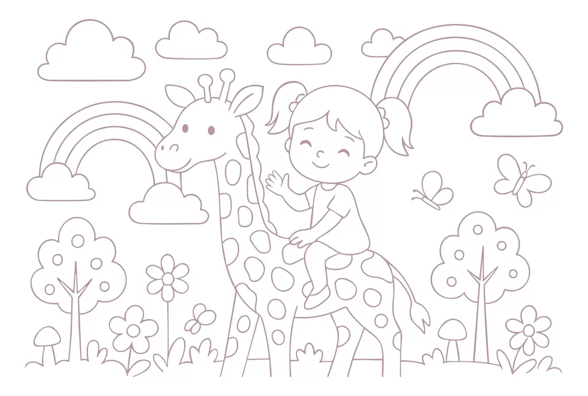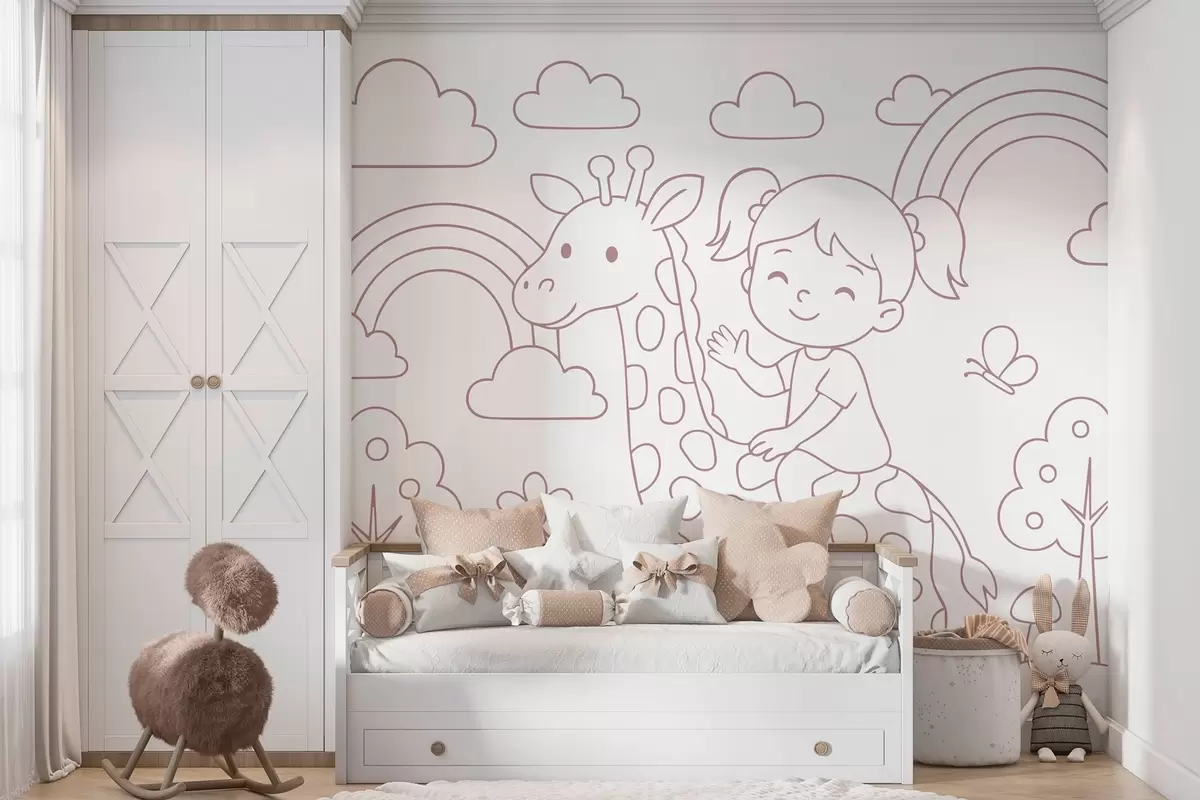 Papier peint photo peinture à la poudre représentant une fille sur une girafe, dans le style d'un livre de coloriage pour enfants N° w04753v1