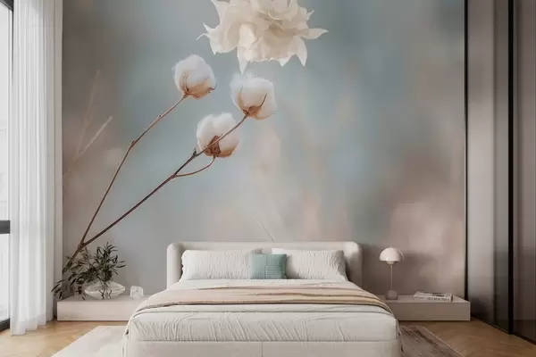 Papier peint photo trois fleurs de coton sur un fond flou N° w04820
