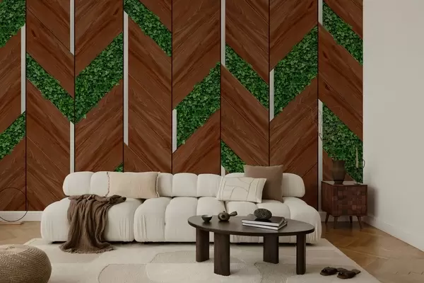 Papier peint photo imitation de panneaux en bois foncé avec inserts végétaux N° w04875v1