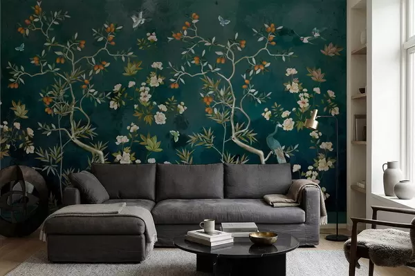 Papier peint photo Scène décorative avec des arbres, des fleurs et des oiseaux sur fond sombre N° w05004